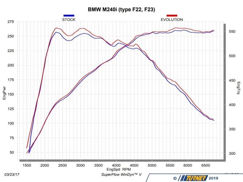 This Akrapovic Evolution exhaust improves upon the stock exhaust system of the BMW M240i in numerous areas. The first visible improvement is the additional power of 6.5 HP (at 5500 rpm) and 12.6 Nm (at 3000 rpm). The range between 2.000 rpm and 3.500 rpm ย was particularly improved. A noticeable improvement can also be observed at high RPM where the Evolution gives more power. This sporty elegance makes this Bavarian machine stand out from the rest and offers the taste of a more powerful version, accentuated with the additional power gains and weight losses of the Evolution system. The dual-mode ECU-controlled valve exhaust from Akrapovicย offers stock-level sound at normal cruising, and a joyful deep sporty note when driving the M240i more dynamically. The Evolution systems replace the stock exhaust from the catalytic converters back.