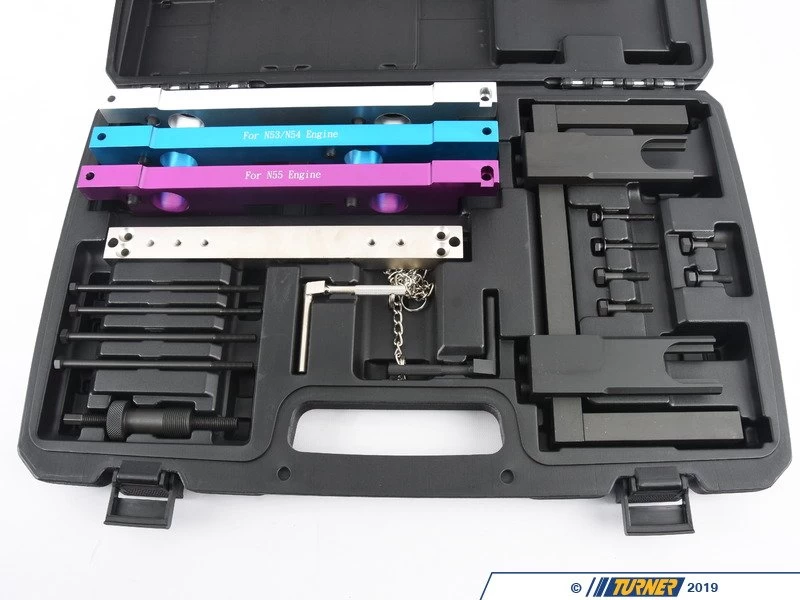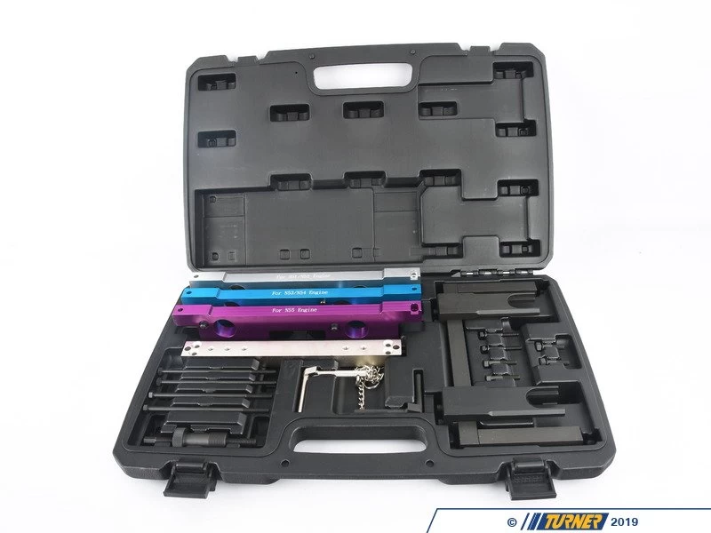 Sets cam, valve & VANOS timing on BMW N51, N52, N53, N54 & N55 engines. Includes camshaft fixture with hold-down bolts, 3 alignment gauges and TDC pin.