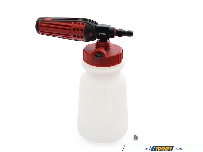 The Brilliant Finishโข Foam Cannon was built from the ground up utilizing innovative design, helping to make washing fun. Powered by your pressure-washer, the cannon converts your favorite car wash into a powerful, clinging foam that loosens shine-stealing abrasives & grime, preventing wash-induced scratches. Simply foam on your car wash, relax a few minutes, then high-pressure rinse for scratch-free washing. In most cases, you can immediately dry. For stubborn road grime, you will need to perform a quick contact wash with your favorite microfiber wash pad and car wash. This cannon is loaded with premium features including, a manifold machined from solid billet aluminum, then electroplated internally and externally to resist corrosion. The cannon’s machined barrel features a proprietary rifling pattern enhances foam creation relative to ordinary foam lances. The cap includes dual-thread patterns making it compatible with include 33.8 oz jar, and Griot’s Garage 22 & 35 oz bottles. Its wide-mouth 33.8 oz jar is stable at rest and makes for quick mixing, typically only requiring 2 – 4 oz of your favorite wash. The cannon’s nozzle adjusts to produce a wide spray pattern of up to 40ยฐ for efficient coverage or a narrow 0ยฐ stream for long-range dispensing on car roofs, trucks, and RVs. An integrated chemical flow valve allows you to adjust foam output with the turn of a dial.