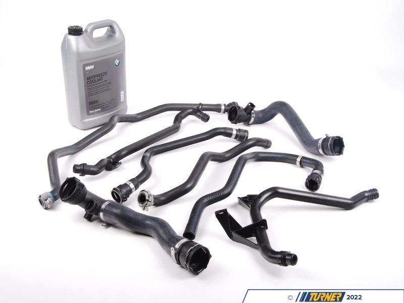 The cooling hoses on your BMW are exposed to vast temperature changes, as well as exposure the elements. Over time, they will fail and can cause you to be stranded, or a worse failure. Turner Motorsport has created a kit that includes all of the necessary cooling system hoses as well as a gallon of coolant to correctly service your cooling system.