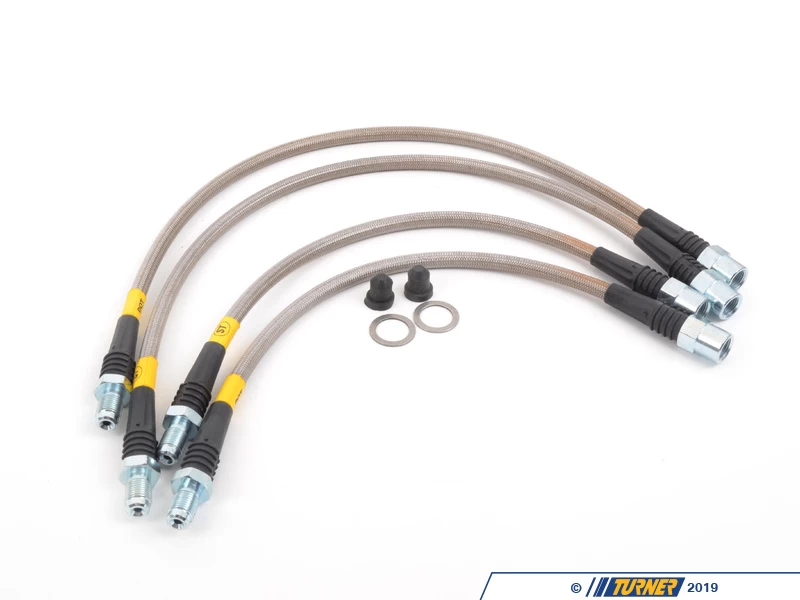 E39 5 Series Stainless Steel Line Set – These lines are DOT approved and also feature a clear plastic outside protective coating.
