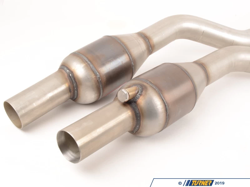 Supersprint sport cats for the M5/M6 are designed to work with their performance headers and replace the stock secondary cats. The Supersprint sport cats are much freer-flowing than a factory-style cat. With less restriction, less effort is required to move the exhaust gasses which will free up horsepower and torque. This cat section will mount to the Supersprint merge collectors and then to a Supersprint or stock section 2. These are built with O2 sensor bungs pre-installed after the cat if you wanted to extend your stock post-cat O2 sensors (however, special software may still be needed).