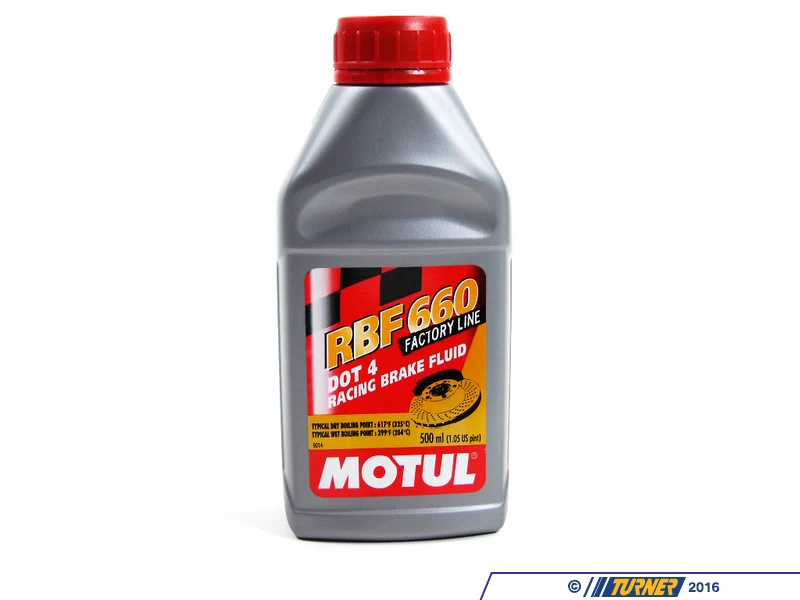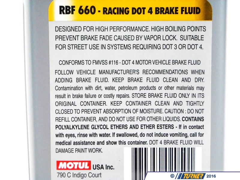 Motul RBF660 is an ultra high-performance DOT4-rated brake fluid intended for track and race vehicles. Motul’s advanced glycol and borate formula have resulted in very high boiling points – even though it’s rated as a DOT4 fluid, it’s boiling points exceed DOT5 specs. With such a high boiling point brake fade and vapor lock due to overheating is all but eliminated. Even with a higher wet boiling point, this fluid will absorb moisture faster than most other DOT4 fluids so it will require more frequent changes than other types.
