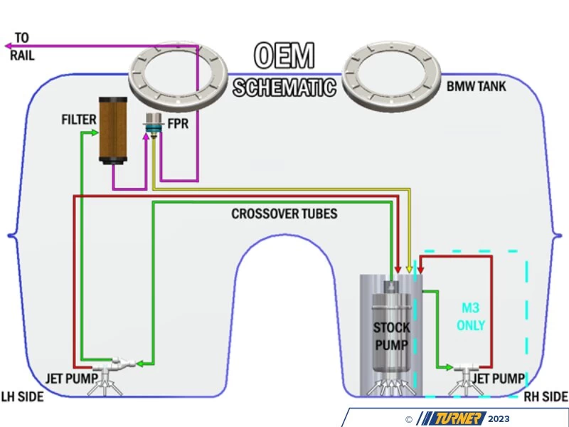 In this setup, the BMW fuel pump serves as a “lift” pump, maintaining fuel volume in the Fuel Hanger Surge Tank via a dedicated orifice. This guarantees sufficient pressure for the venturi jet pump(s) to operate, ensuring consistent fuel delivery. Excess fuel in the FHST cycles back to the OEM tank through a one-way check valveย ensuring a steady fuel supply. Unlike conventional surge tanks, which rely on pump flow matching, this FHST employs additional mechanisms to continuously deliver fuel regardless of fluctuations in other fuel sources. When the main tank nears depletion, the lift pump and Fuel Pressure Regulator step in to supply fuel to the FHST.