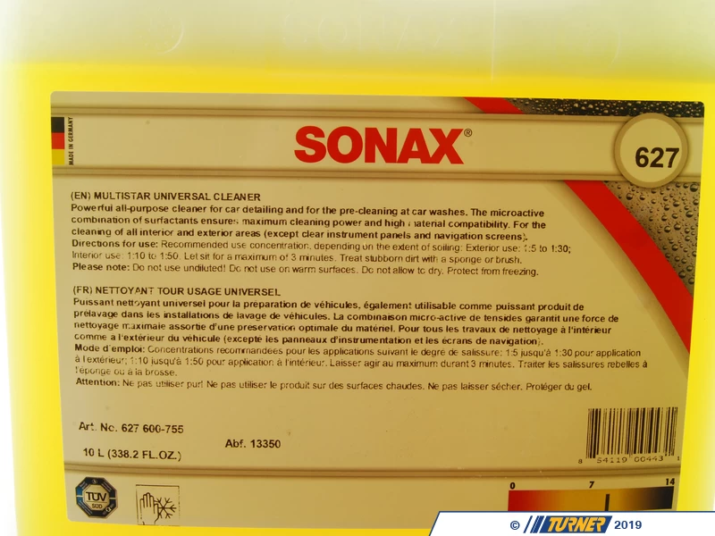 SONAX MultiStar Universal Cleanerย is an ultra versatile, universal cleaner, for exterior & interior surfaces. Strong enough to clean tough areas such as wheel wells and engine compartments, but is also gentle enough to clean almost any interior surface without staining or adverse effects. Safe on any interior surface except clear plastics (instrument panel cover, nav screen) & leather.