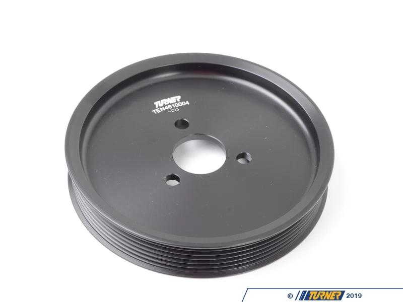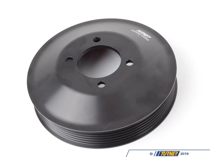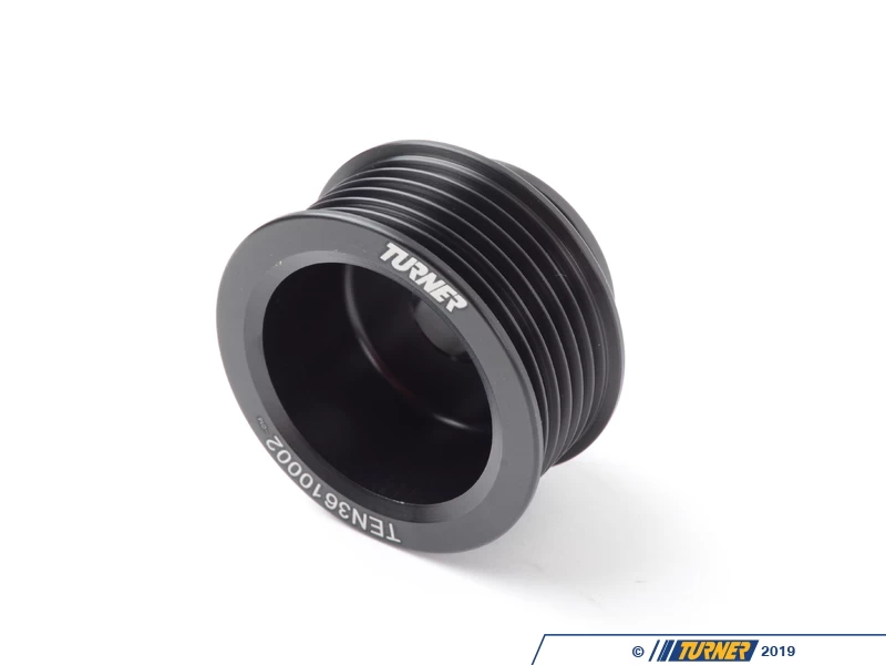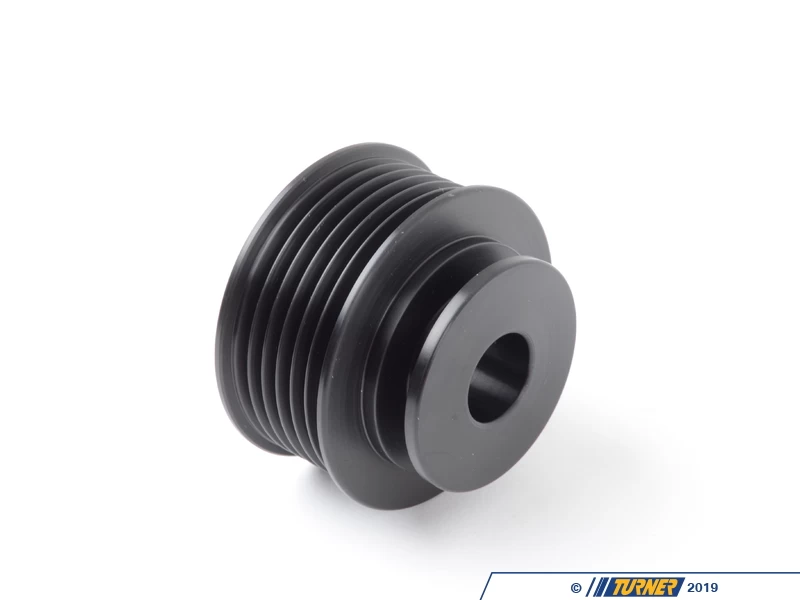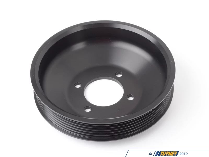 Our pulleys are made from T-6061 aluminum and finished in a durable black hard anodize that is very resistant to wear, chemical exposure, and heat. We designed our pulleys to look similar to the factory parts but also to be stronger and, in most cases, slightly lighter too. For example, a Turner alternator pulley is less than half the weight of the stock steel pulley! With our hardcoat aluminum you will never have to worry about a serious failure of a stock plastic pulley. A ‘stealth’ approach to aesthetics was our goal and we let the results speak for the pulley design. Installation is straight forward and easy with simple hand tools. Removal of the fan is required for access to the front of the engine. Total install time for a 3-piece pulley set should be around 1.5 hours. A new longer belt is included and we also recommend replacing the separate A/C belt, belt tensioners, and the guide and deflection pulleys at the same time.