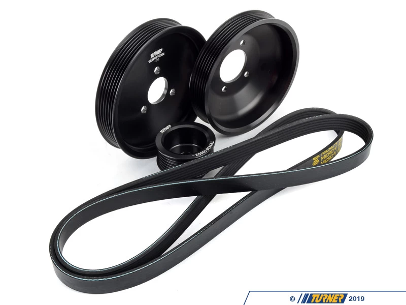 Stereo Systems. We offer our kits in two different ways: the full Power Pulley Kit with all 3 pulleys or a 2 pulley kit if you do not wish to underdrive your alternator (for large stereo systems or other battery-draining modifications). Our kits have been tested for compatability with the factory premium stereo systems (Harmon Kardon, etc). But any major alterations or upgrades from the factory system will work best with our 2 pulley kit and no underdriving of the alternator. For all stock stereo systems the 3 pulley set is recommended because the Turner alternator pulley will help make more power and is also much lighter than the stock pulley.