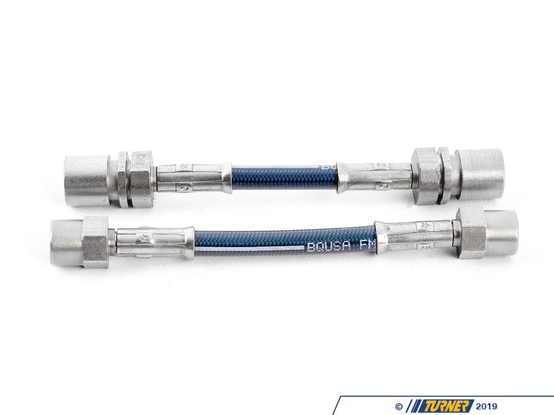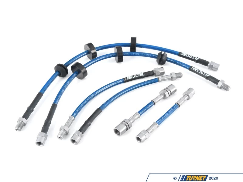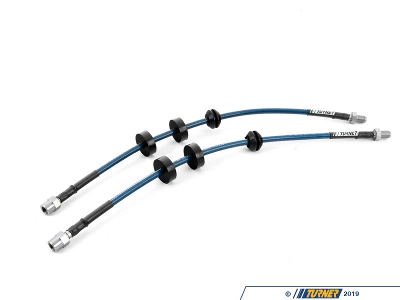Evenย new, factory rubber brake hoses expand under pressure, requiring increased fluid volume and more pedal travel for the desired stopping force. What is often thought to be brake fade or fluid boiling, can actually be the brake lines expanding under high pressure. This expansion is even more prominent in aged and worn rubber hoses. Turner Motorsport Stainless Steel brake lines are engineered and assembled with braided stainless steel mesh and offer superior expansion resistance and reinforcement. The resistance to expansion creates a firmer pedal, and a more direct pedal feel. The signature blue polymer coating provides additional protection from the elements and abrasion, which is common with the constant movement of suspension and braking systems.